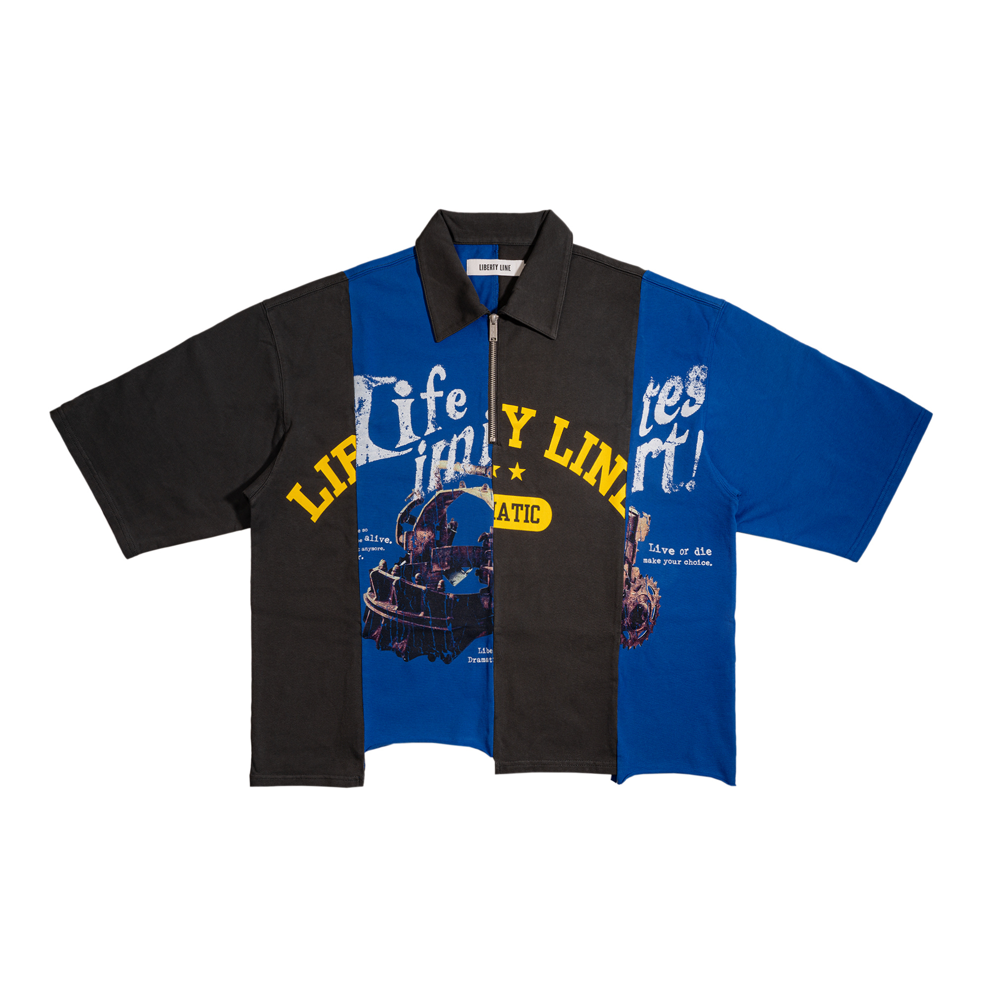 Featuring fragmented text like "Live or die make your choice" and "be alive", this piece makes a definitive statement. The unique color-block panels in shades of blue, grey, and off-white are contrasted with gritty, textured prints, creating a visually dynamic look. Crafted from 100% cotton for a soft and comfortable feel, this polo features a modern zip-up collar and a relaxed fit, making it a perfect standout piece for any casual or streetwear wardrobe.