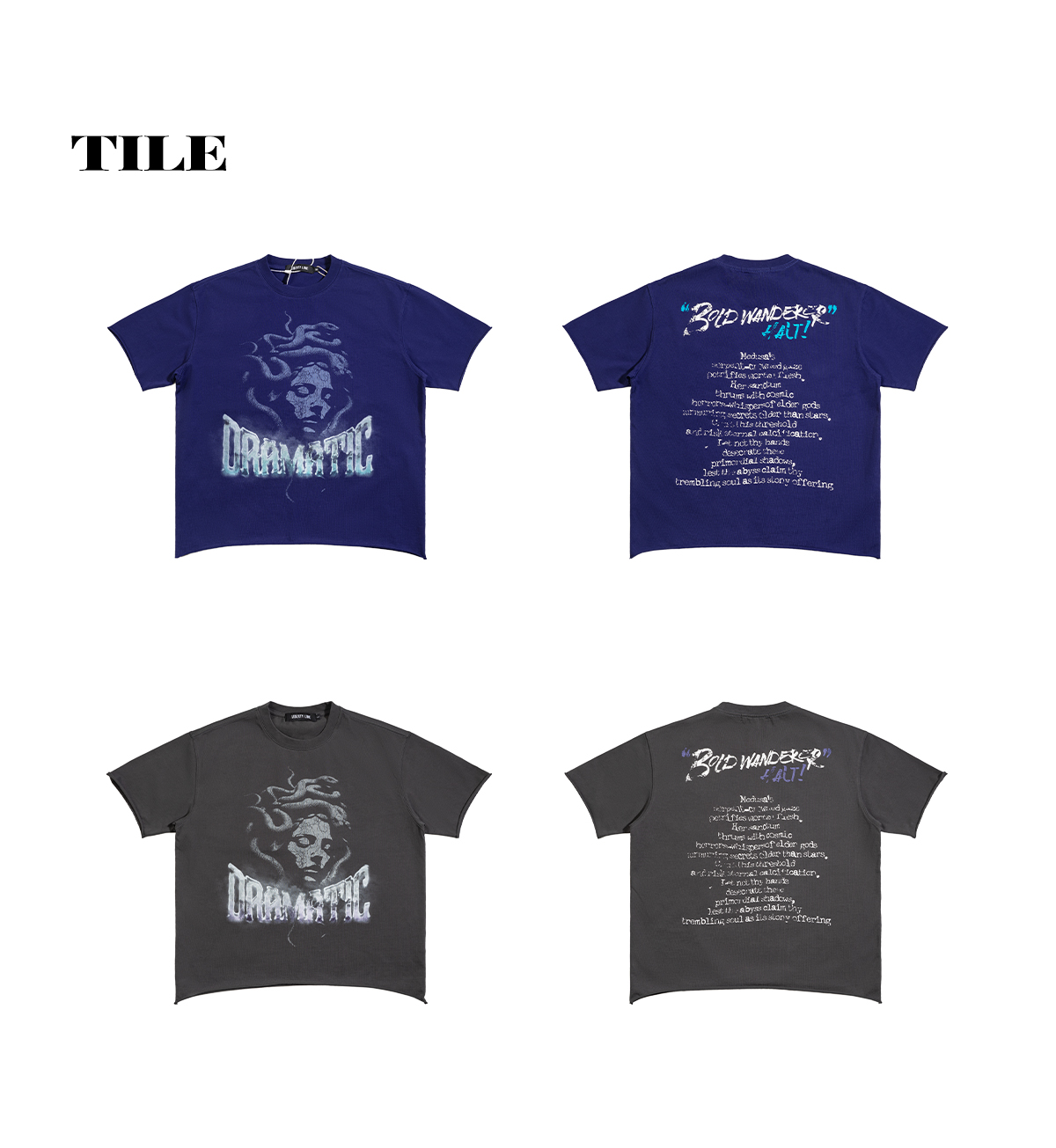 Channel the mythic power of Medusa with the “Bold Wanderer” T-shirt from Liberty Line. This striking tee features a large, ethereal graphic of Medusa’s face on the front, rendered in a faded, vintage style and paired with the word “Dramatic” in a gothic font. The back continues the narrative with “Bold Wanderer” and a poetic, esoteric text block, adding an element of dark fantasy to the design.