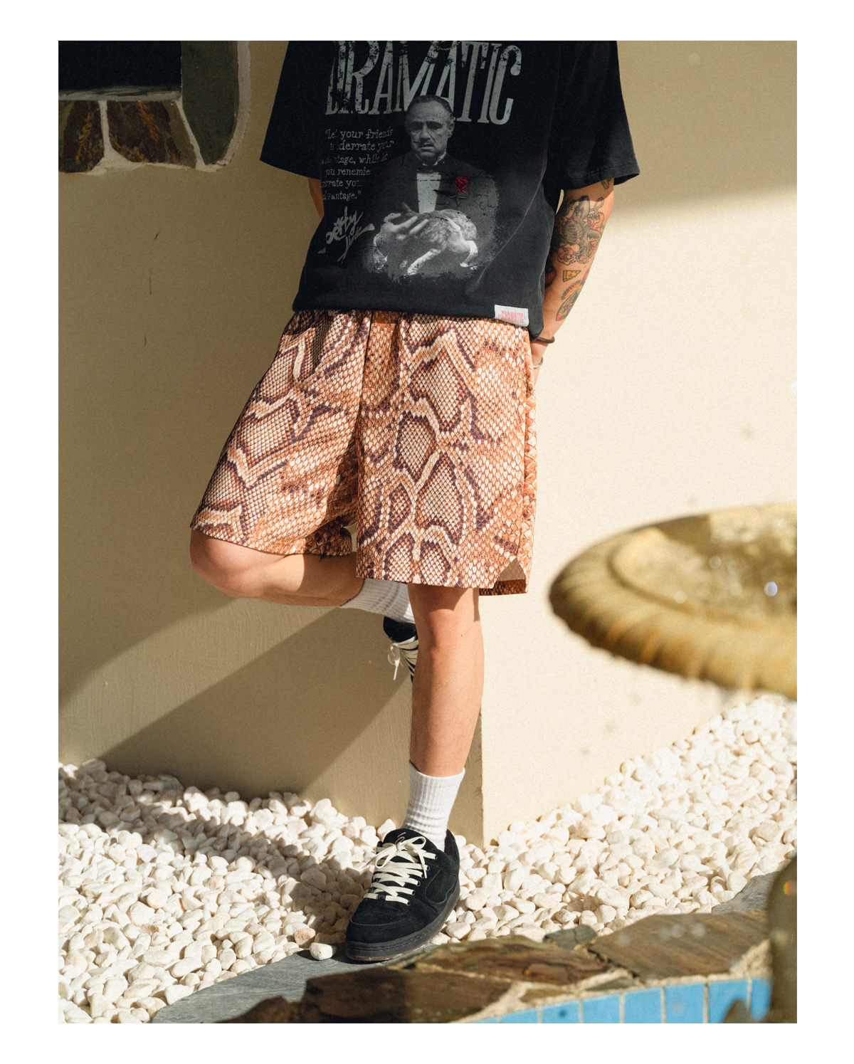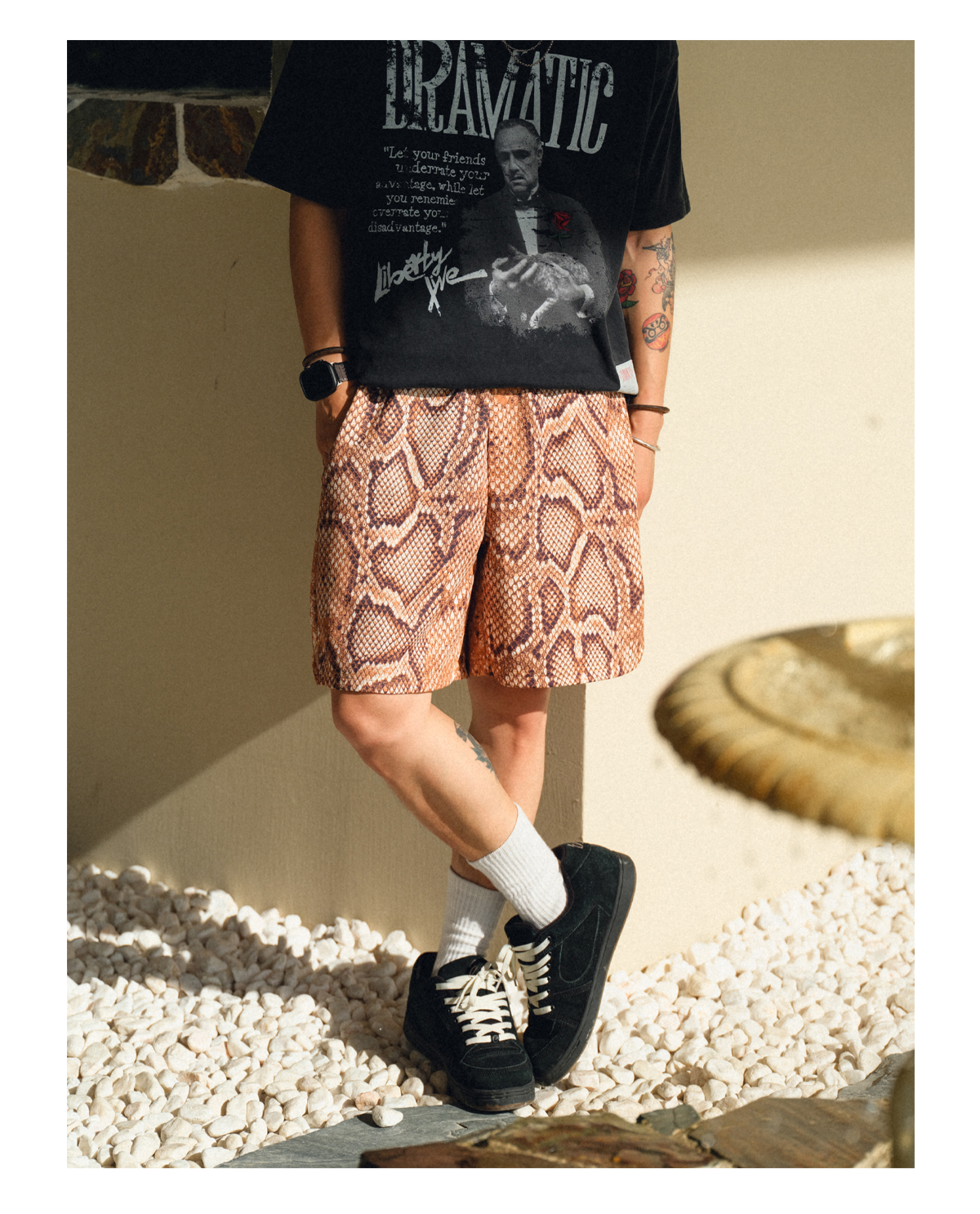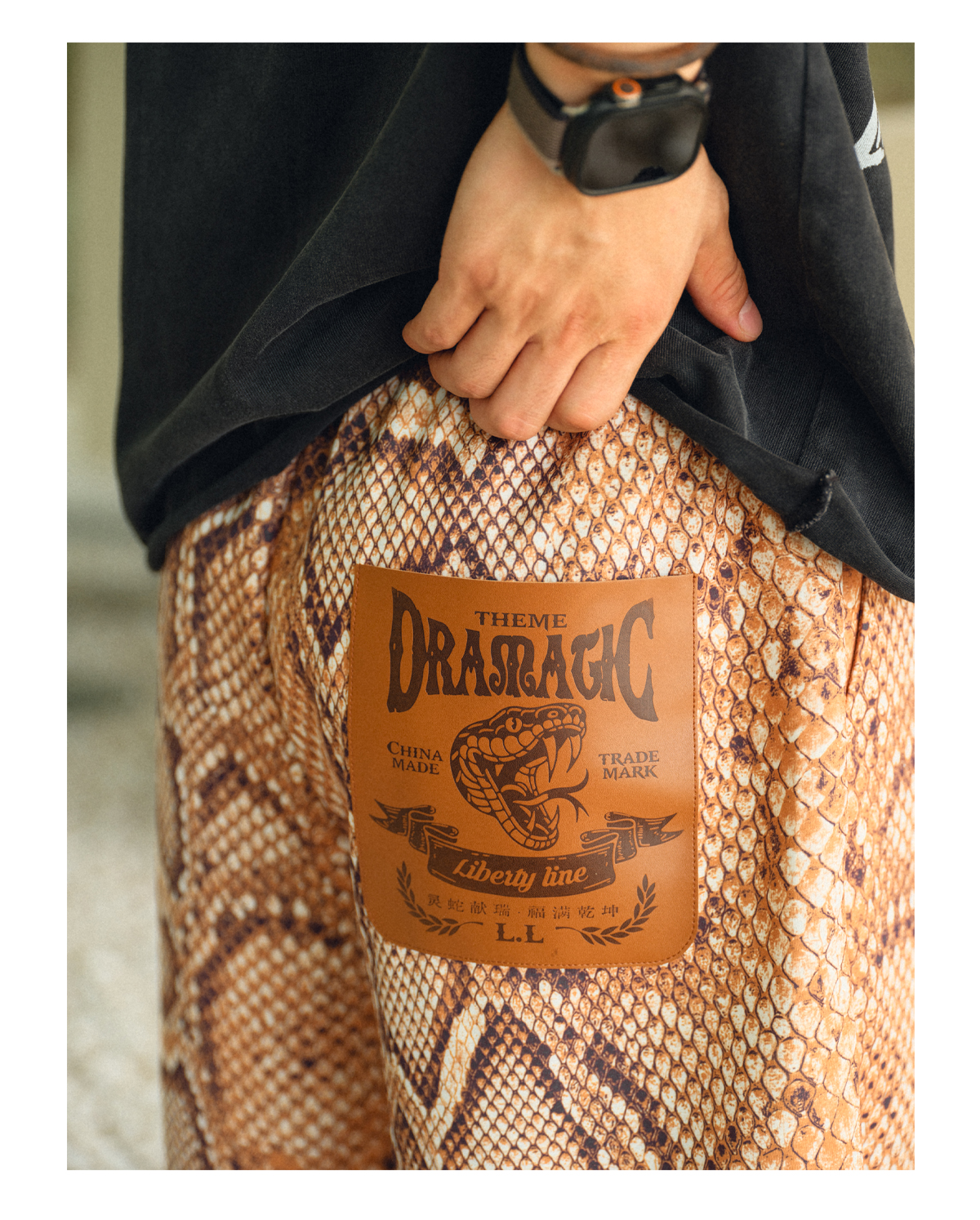 The design features a comfortable elastic waistband with an adjustable drawstring, a loose fit for freedom of movement, and side vents for added breathability. A standout detail is the custom embossed faux leather patch on the back, featuring intricate snake graphics and “Drasragic” branding, adding a touch of luxury to the edgy streetwear vibe.